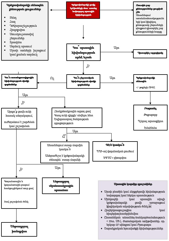 ա. Բացառել սրտային պատճառները, բ. Կրծքավանդակի ցավի 3 ամենատարածված պատճառների բացառում` ● Խոնդրիտ, ● Կմախքամկանային, ● Շնչառական: |