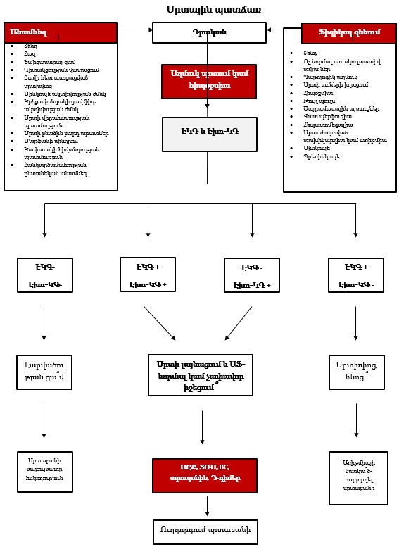 Սուր սկիզբ; Սրտի վիրահատության պատմություն; Սրտի բնածին բարդ արատներ; Մարֆանի սինդրոմ; Կավասակի հիվանդության պատմություն; Հանկարծամահության ընտանեկան անամնեզ: |