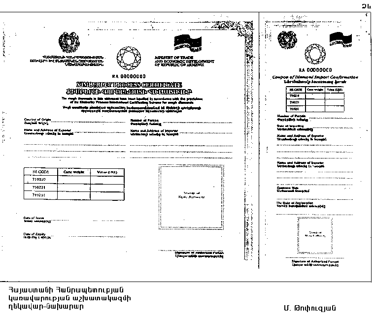 Խնդրում եմ տրամադրել Քիմբերլի գործընթացի հավաստագիր` Հայաստանի Հանրապետությունից ալմաստների արտահանման համար: