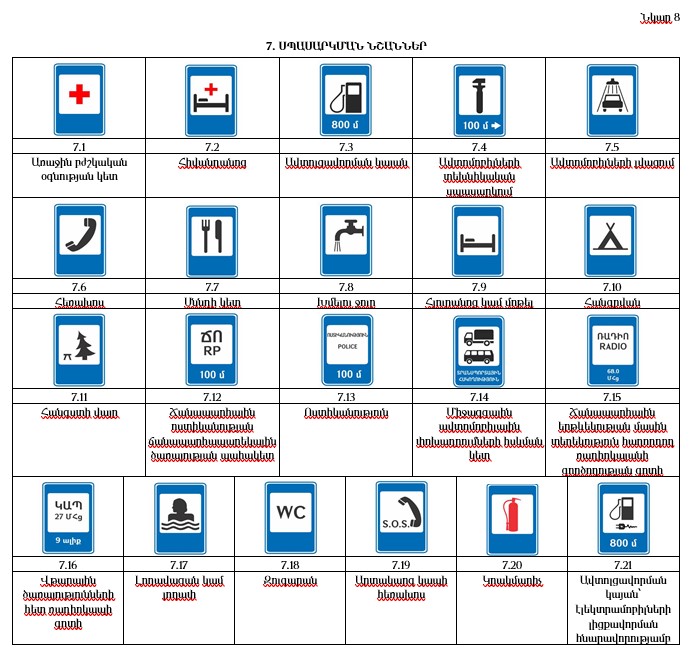 «54.6. 7.21 «Ավտոլցավորման կայան՝ էլեկտրամոբիլների լիցքավորման հնարավորությամբ» նշանները կիրառվում են էլեկտրամոբիլների լիցքավորման հնարավորությամբ ավտոլցավորման կայանի տեղը նշելու համար: Անհրաժեշտության դեպքում նշանները բնակավայրերից դուրս նախօրոք կարող են տեղակայվել 400-800 մ հեռավորության վրա:»,