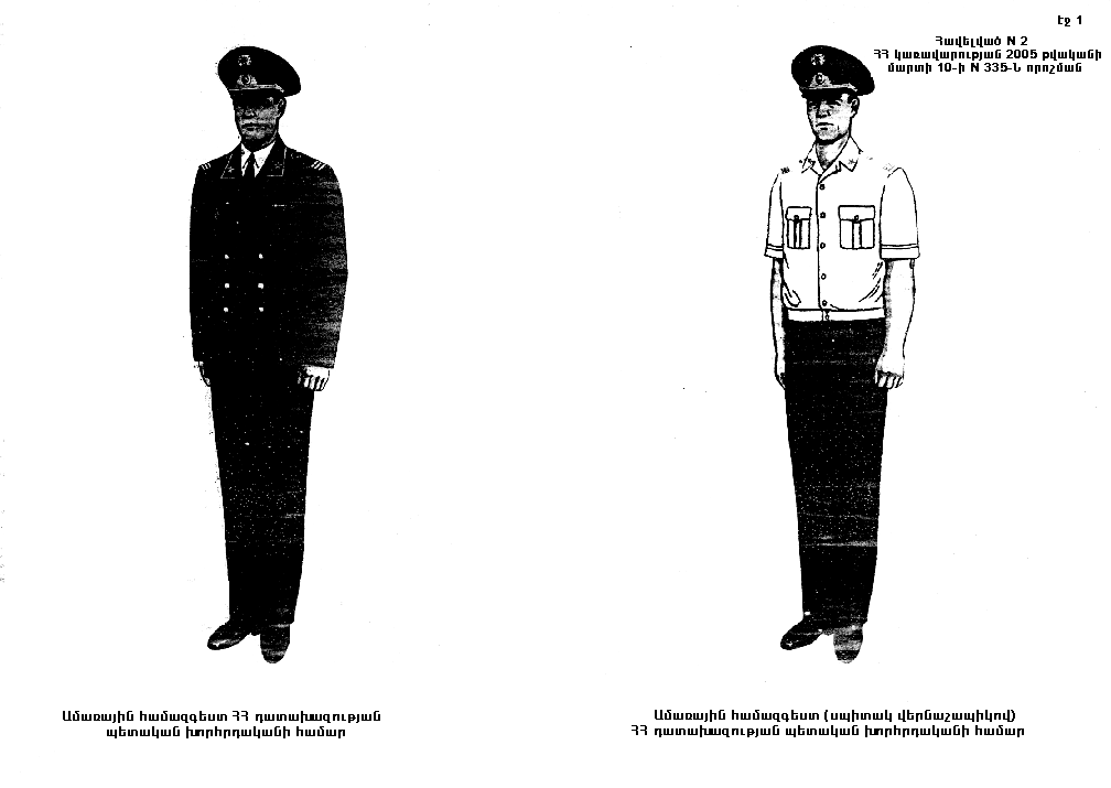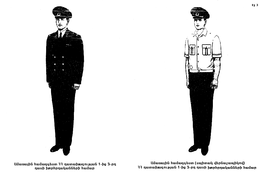 Բարձրագույն դասային աստիճան ունեցող աշխատողների համար տաբատի վրա, եզրակարից 0,5 սմ հեռավորությամբ, ձգվում է մուգ կանաչավուն վրակարվածք` 2,2 սմ լայնությամբ շերտով, տաբատի կողքի կարի ամբողջ երկայնքով: