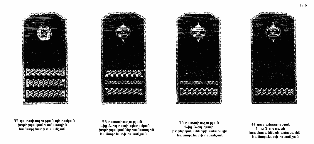 1-ին, 2-րդ և 3-րդ դասերի իրավաբանների համազգեստի ուսանշանների վերին հատվածում տեղադրվում է Հայաստանի Հանրապետության դատախազության խորհրդանիշը, ներքևի հատվածում ոսկեգույն թելերով գործվում է մեկ լայն ժապավենատիպ հյուսվածք: