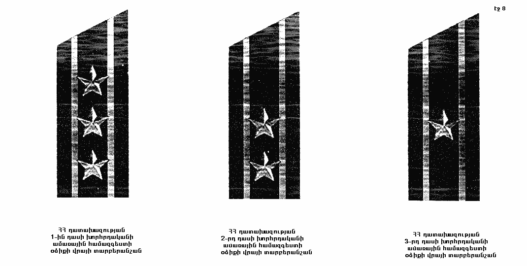 Արդարադատության 1-ին, 2-րդ և 3-րդ դասերի խորհրդականների մակակարի մակերեսն ունի 2 մուգ դեղնավուն լուսաշերտ: Արդարադատության 1-ին դասի խորհրդականի մակակարի մակերեսին ամրացվում է 3 ոսկեզօծ հնգաթև աստղ` 20 մմ տրամագծով, արդարադատության 2-րդ դասի խորհրդականի մակակարի մակերեսին` 2 ոսկեգույն հնգաթև աստղ` 20 մմ տրամագծով, արդարադատության 3-րդ դասի խորհրդականի մակակարի մակերեսին` մեկ ոսկեգույն հնգաթև աստղ` 20 մմ տրամագծով: