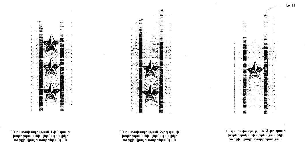 1-ին, 2-րդ և 3-րդ դասերի իրավաբանների մակակարի մակերեսն ունի մեկ մուգ դեղնավուն լուսաշերտ: 1-ին դասի իրավաբանի մակակարի մակերեսին ամրացվում է 4 ոսկեգույն հնգաթև աստղ` 13 մմ տրամագծով, 2-րդ դասի իրավաբանի մակակարի մակերեսին` 3 ոսկեգույն հնգաթև աստղ` 13 մմ տրամագծով, 3-րդ դասի իրավաբանի մակակարի մակերեսին` 2 ոսկեգույն աստղ` 13 մմ տրամագծով: