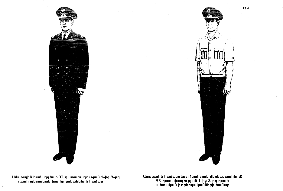 Բարձրագույն և արդարադատության 1-ին դասի խորհրդականի դասային աստիճան ունեցող աշխատողների համազգեստը մուգ կապտագույն գաբարդինից է, իսկ 2-րդ դասի իրավաբանից մինչև արդարադատության 2-րդ դասի խորհրդականի դասային աստիճան ունեցող աշխատողներինը` մուգ կապտագույն կոստյումի կտորից, օձիքը և թևքածալերը` մուգ կանաչավուն եզրաշերտով, որոնց լայնությունը 2,5 մմ է, իսկ թևքածալերի վրա կա նաև 2 փոքր կոճակ: