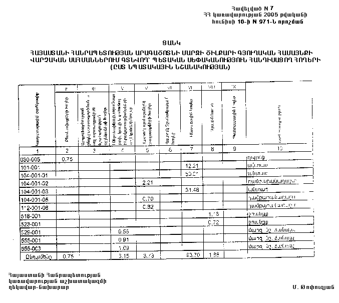 7. Հայաստանի Հանրապետության Արագածոտնի մարզպետին՝ Հայաստանի Հանրապետության կառավարության 2000 թվականի հոկտեմբերի 23-ի N 656 որոշմամբ սահմանված կարգով՝ սկզբնական հաշվառման տվյալների հիման վրա ապահովել մարզի տարածքում ընթացիկ հաշվառման աշխատանքների իրականացումը: