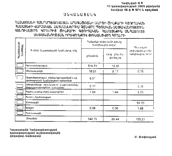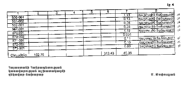 4. Ընդունել ի գիտություն Հայաստանի Հանրապետության Արագածոտնի մարզի Ծիլքարի գյուղական համայնքի հողային ֆոնդի առկայության և բաշխման մասին հաշվետվությունը՝ 2005 թվականի հունվարի 1-ի դրությամբ՝ համաձայն NN 8 և 9 հավելվածների: