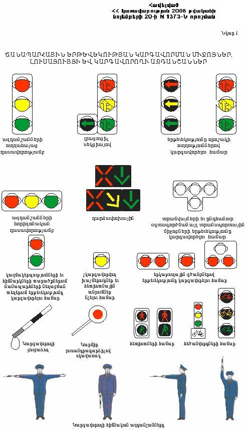 20. Վարորդներն ու հետիոտները պետք է կատարեն կարգավորողի կարգադրությունների և ազդանշանների պահանջները, նույնիսկ այն դեպքերում, եթե դրանք հակասում են լուսացույցի ազդանշաններին ու ճանապարհային նշանների կամ գծանշումների պահանջներին: