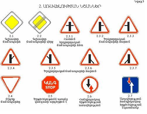 1) գլխավոր ճանապարհ` 2.1` «Գլխավոր ճանապարհ», 2.3.1` «Հատում երկրորդական ճանապարհի հետ», 2.3.2 - 2.3.7` «Երկրորդական ճանապարհի հարում», կամ 5.1` «Ավտոմայրուղի» նշաններով նշված ճանապարհ հատողի (հարողի) նկատմամբ կամ կոշտ ծածկույթով (ասֆալտբետոն, ցեմենտբետոն, քարե նյութեր և այլն) ճանապարհ հողային ծածկույթ ունեցողի նկատմամբ, կամ էլ ցանկացած ճանապարհ մերձակա տարածքներից դուրս եկող ճանապարհի նկատմամբ: Առանց ծածկույթի հողային ճանապարհի վրա, անմիջապես խաչմերուկից առաջ, ծածկույթով հատվածի առկայությունն այդ ճանապարհը հատվող ծածկույթով ճանապարհին հավասարազոր չի դարձնում.