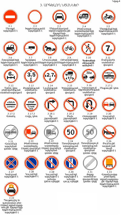 18. Լուսացույցի (բացի դարձափոխայինից) կամ կարգավորողի արգելող ազդանշանի դեպքում վարորդը պետք է կանգ առնի «Կանգ-գիծ» գծանշման (կամ 6.16` «Կանգ-գիծ» նշանի) առջև, իսկ դրա բացակայության դեպքում`