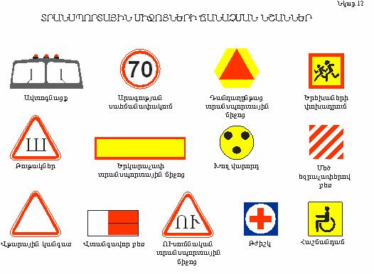 «Ուսումնական տրանսպորտային միջոց»` վարման ուսուցման նպատակով օգտագործվող մեխանիկական տրանսպորտային միջոցների առջևի և հետևի մասերում սև գույնի «ՈՒ» տառի պատկերով, կարմիր եզրաշերտով, սպիտակ գույնի հավասարակողմ եռանկյան տեսքով (կողմը` առնվազն 200 մմ, եզրաշերտի լայնությունը` կողմի 1/10-ի չափով):