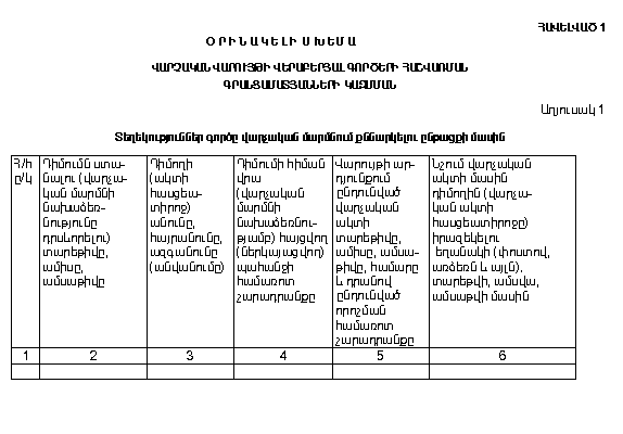 33. Ակտերի հաշվառման գրանցամատյանում հաշվառվող ակտի վերաբերյալ նշվում են հետևյալ տեղեկությունները՝