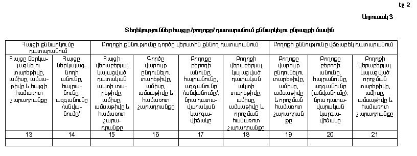 գ/ N 3 աղյուսակում նշել տվյալ գործով դատարան ներկայացված հայցի, դատարան բերված բողոքի քննարկման և դրանց վերաբերյալ ըստ էության որոշում կայացնելու մասին տեղեկությունները:
