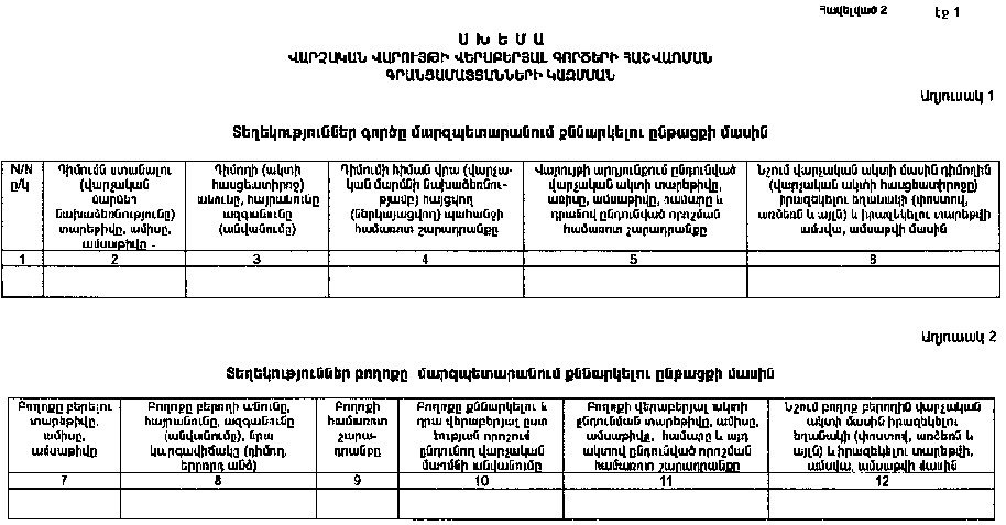 ՀԱՅԱՍՏԱՆԻ ՀԱՆՐԱՊԵՏՈՒԹՅԱՆ ՏԱՎՈՒՇԻ ՄԱՐԶՊԵՏԱՐԱՆՈՒՄ ՎԱՐՉԱԿԱՆ ՎԱՐՈՒՅԹԻ ՎԵՐԱԲԵՐՅԱԼ ԳՈՐԾԵՐԻ, ԴՐԱՆՑ ՀԱՇՎԱՌՄԱՆ ԳՐԱՆՑԱՄԱՏՅԱՆՆԵՐԻ ԵՎ ՎԱՐՉԱԿԱՆ ԱԿՏԵՐԻ ՀԱՇՎԱՌՄԱՆ ԳՐԱՆՑԱՄԱՏՅԱՆՆԵՐԻ ՎԱՐՄԱՆ ԿԱՐԳՆ ՈՒ ՊԱՅՄԱՆՆԵՐԸ ՍԱՀՄԱՆՈՂ ԿԱՐԳԸ ՀԱՍՏԱՏԵԼՈՒ ՄԱՍԻՆ