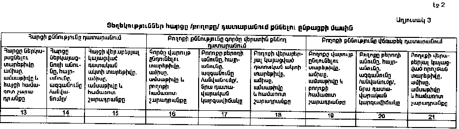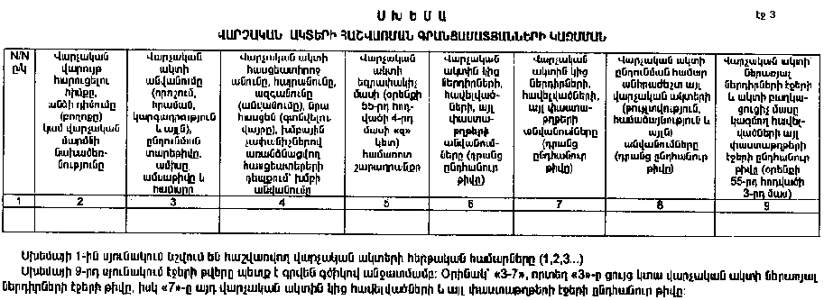28. N 3 աղյուսակը լրացվում է միայն այն դեպքում, երբ տվյալ գործով հայց, իսկ հետագայում նաև բողոք է ներկայացվել դատարան: Այն պետք է կազմի N 2 աղյուսակի շարունակությունը, իսկ եթե բողոքը վարչական կարգով չի բերվել, ապա` N 1 աղյուսակի շարունակությունը: Ըստ որում, պետք է հաշվի առնել այն հանգամանքը, որ վարչական վարույթի վերաբերյալ գործը կարող է քննվել դատական մի քանի ատյաններում: Այդ պատճառով նպատակահարմար է N 3 աղյուսակը բաժանել երեք հավասար մասի յուրաքանչյուրում նշելով`