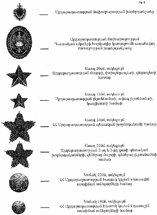 Արդարադատության գեներալ-մայորի, գեներալ-լեյտենանտի կամ արդարադատության 3-րդ դասի պետական խորհրդականի և արդարադատության 2-րդ դասի պետական խորհրդականի ուսանշանների վրա վերին հատվածում ոսկեթելերով գործվում է Արդարադատության նախարարության խորհրդանշանը (վահան, հետևի պլանում պատկերված սուր, կաղնու տերևներով երիզված, 30մմ բարձրությամբ, 20մմ լայնությամբ), ներքևի հատվածում երկու լայն և միջանկյալ նեղ ժապավենատիպ հյուսվածք: