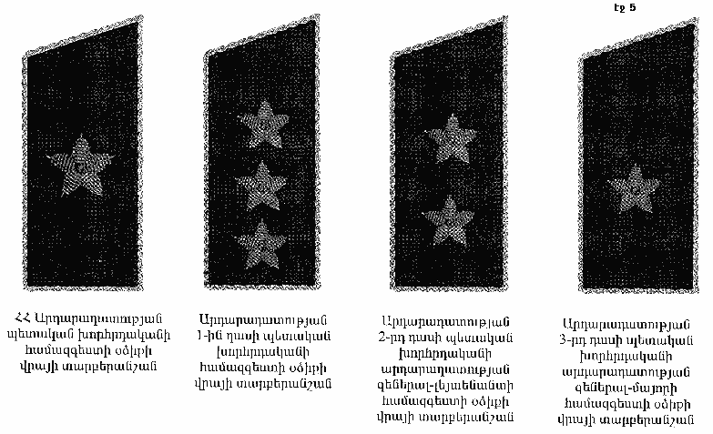 Բարձրագույն խմբի հատուկ կոչում գեներալ-մայոր կամ արդարադատության 3-րդ դասի պետական խորհրդականի մակակարի մակերեսին ամրացվում է մեկ ուռուցիկ ոսկեզօծ հնգաթև աստղ` 22 մմ տրամագծով, գեներալ-լեյտենանտ կամ արդարադատության 2-րդ դասի պետական խորհրդականի մակակարի մակերեսին` երկու ուռուցիկ ոսկեզօծ հնգաթև աստղ` 22 մմ տրամագծով: