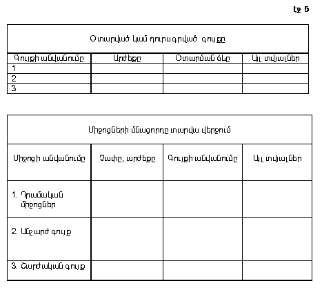 5. Կուսակցության կողմից ընտրարշավների նախապատրաստման և անցկացման համար ծախսված միջոցների հաշվառումը կատարվում է առանձին, նույն ձևերի հիման վրա: Այդ հաշվետվությունները պետք է պարունակեն նշում, այն մասին, թե որ ընտրության նախապատրաստման և անցկացման համար են կատարվել ծախսերը: