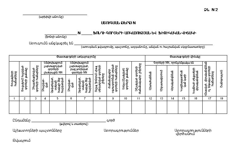 17. Փաստաթղթերի առկայության և պահպանվածության վիճակի ստուգման արդյունքները հաշվառման փաստաթղթերում գրանցվում են փաստաթղթերի որոշակի համալիրի շրջանակում աշխատանքներն ավարտելուց հետո՝ ստուգման թերթի (ձև N 2) և ակտի (ձև N 3) հիման վրա։