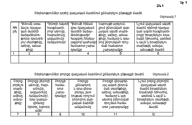 ա/ N 1 աղյուսակում նշել դիմումի հիման վրա կամ վարչական մարմնի նախաձեռնությամբ հարուցված վարույթով գործին ընթացք տալու մասին տեղեկությունները.