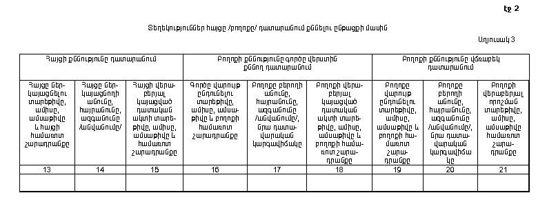 31. N 3 աղյուսակը լրացվում է միայն այն դեպքում, երբ տվյալ գործով հայց, իսկ հետագայում` նաև բողոք է ներկայացվել դատարան: Այն պետք է կազմի N 2 աղյուսակի շարունակությունը, իսկ եթե բողոքը վարչական կարգով չի բերվել, ապա` N 1 աղյուսակի շարունակությունը: N 3 աղյուսակը պետք է բաժանել երեք հավասար մասի` յուրաքանչյուրում նշելով`