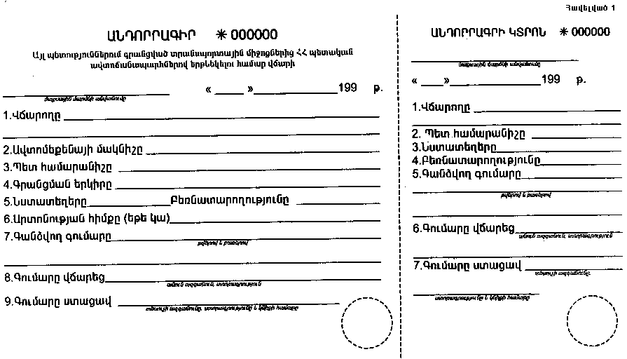 ԱՅԼ ՊԵՏՈՒԹՅՈՒՆՆԵՐՈՒՄ ԳՐԱՆՑՎԱԾ ՏՐԱՆՍՊՈՐՏԱՅԻՆ ՄԻՋՈՑՆԵՐՈՎ ՀԱՅԱՍՏԱՆԻ ՀԱՆՐԱՊԵՏՈՒԹՅԱՆ ՊԵՏԱԿԱՆ ԱՎՏՈՄՈԲԻԼԱՅԻՆ ՃԱՆԱՊԱՐՀՆԵՐԻՑ ՕԳՏՎԵԼՈՒ ՀԱՄԱՐ ՎՃԱՐԻ ՀԱՇՎԱՐԿՄԱՆ ԵՎ ՎՃԱՐՄԱՆ ԿԱՐԳԻ ՄԱՍԻՆ