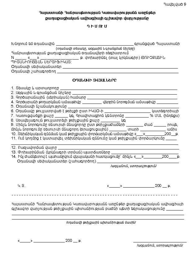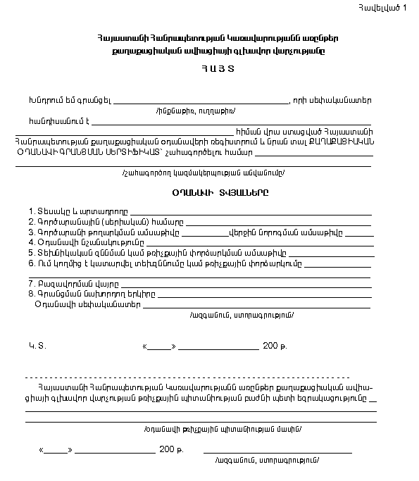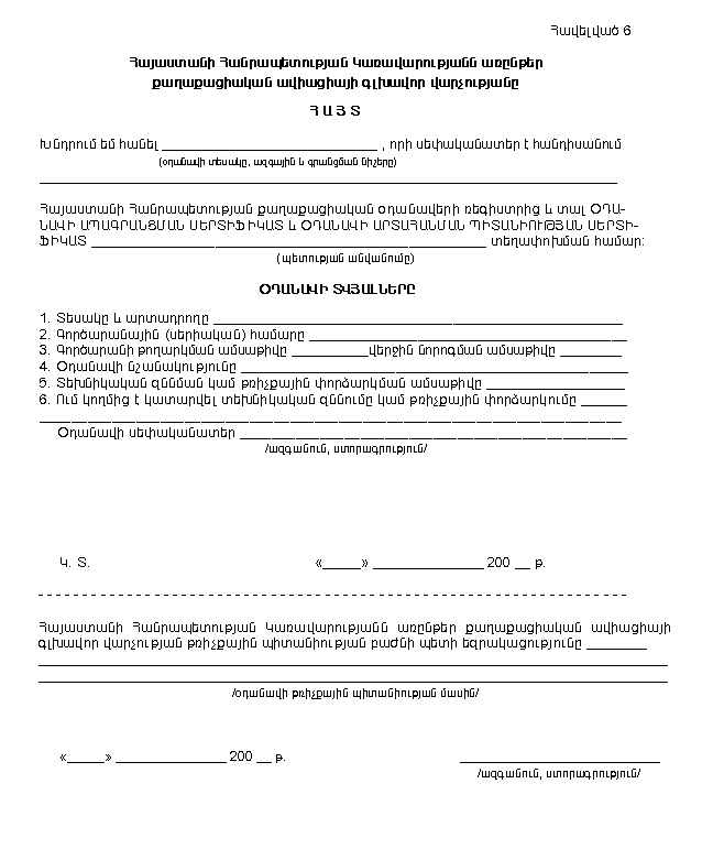 16. Օդանավի սեփականատերը հայտ է ներկայացնում Գլխավոր Վարչություն` օդանավը գրանցելու վերաբերյալ (Հավելված 1):