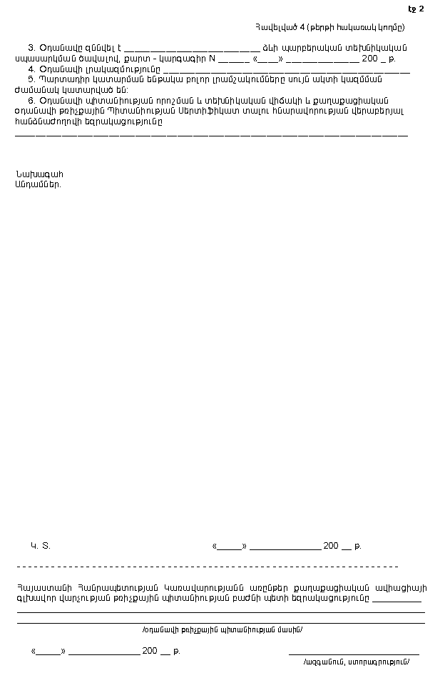 բ) օդանավի թռիչքային պիտանիության որոշման և տեխնիկական վիճակի ստուգման ակտի (Հավելված 4):