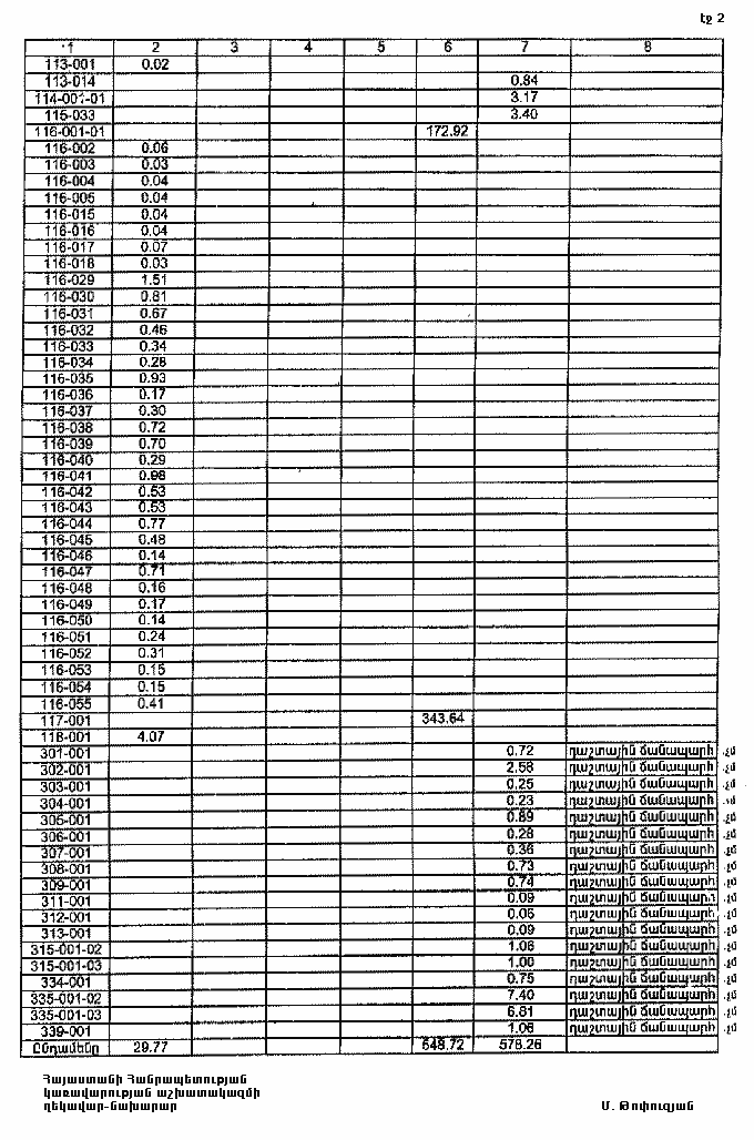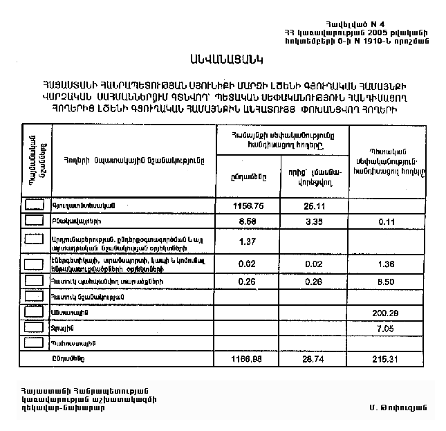 4. Ընդունել ի գիտություն Հայաստանի Հանրապետության Սյունիքի մարզի Լծենի գյուղական համայնքի հողային ֆոնդի առկայության և բաշխման մասին հաշվետվությունը` 2005 թվականի հունվարի 1-ի դրությամբ` համաձայն NN 8 և 9 հավելվածների: