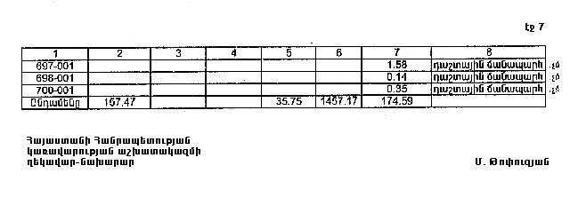 7. Հայաստանի Հանրապետության Լոռու մարզպետին՝ Հայաստանի Հանրապետության կառավարության 2000 թվականի հոկտեմբերի 23-ի N 656 որոշմամբ սահմանված կարգով՝ սկզբնական հաշվառման տվյալների հիման վրա ապահովել մարզի տարածքում ընթացիկ հաշվառման աշխատանքների իրականացումը: