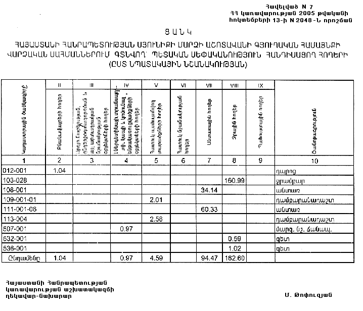7. Հայաստանի Հանրապետության Սյունիքի մարզպետին` Հայաստանի Հանրապետության կառավարության 2000 թվականի հոկտեմբերի 23-ի N 656 որոշմամբ սահմանված կարգով` սկզբնական հաշվառման տվյալների հիման վրա ապահովել մարզի տարածքում ընթացիկ հաշվառման աշխատանքների իրականացումը: