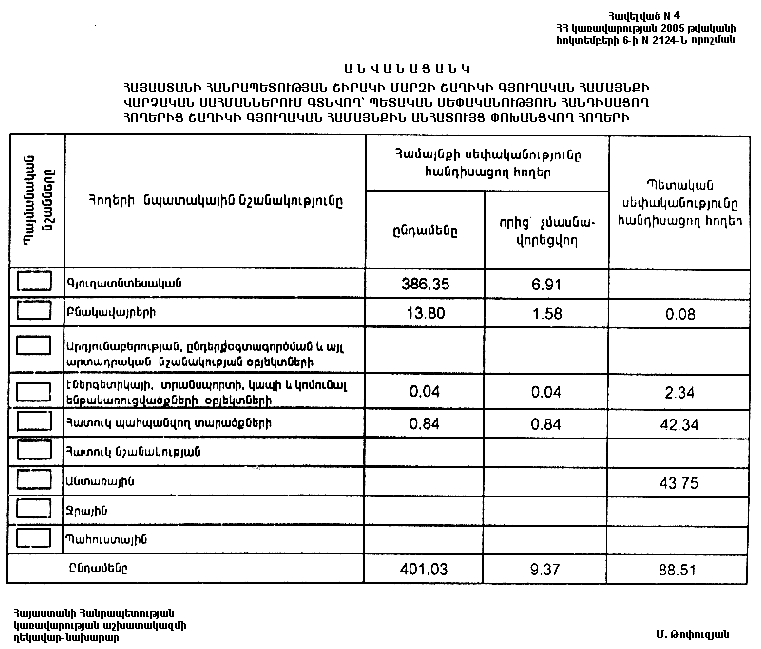 ա) Հայաստանի Հանրապետության Շիրակի մարզի Շաղիկի գյուղական համայնքին անհատույց սեփականության իրավունքով փոխանցվող 401.03 հեկտար հողերից 9.37 հեկտարը մասնավորեցման ենթակա չէ.