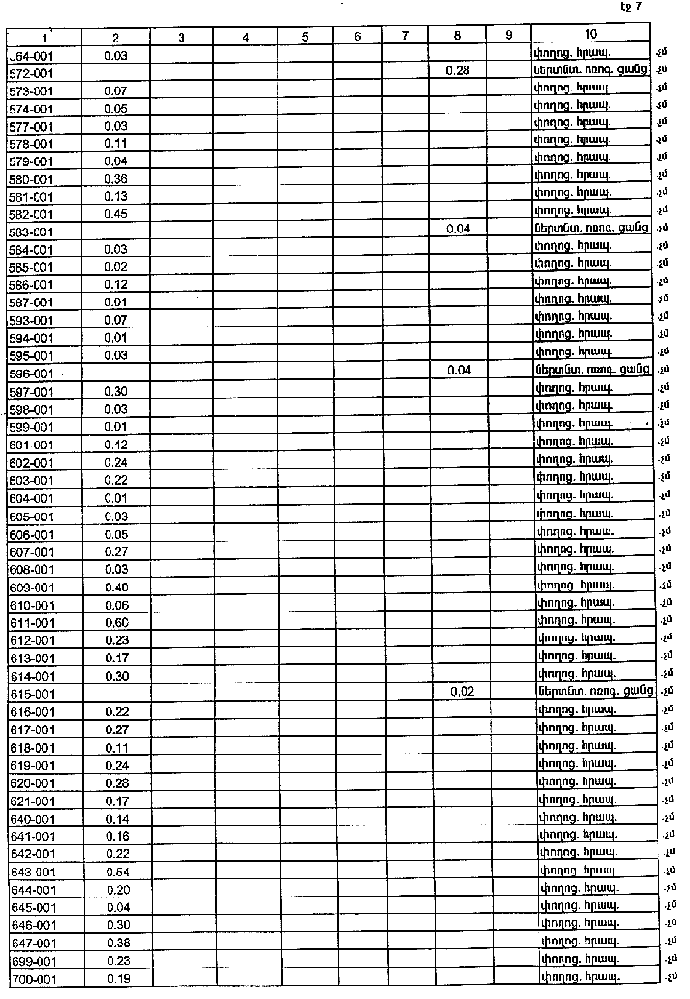 Կադաստրային II III IV V VI VII VIII IX Ծանոթա- Բնակա- Արդյունա- Էներգետիկայի, Հատուկ պահ- Հատուկ նշանա- Անտա- Ջրային Պահուս- 1 2 3 4 5 6 7 8 9 10 046-001 0.24 հատուկ նշ. հողեր 059-008 1.13 դպրոց 179-001-02 2.68 արգելավայր 184-001-02 0.76 դամբարանադաշտ 184-001-03 2.76 արգելավայր 184-001-04 5.23 դամբարանադաշտ 184-001-06 2.00 դամբարանադաշտ 184-013 2.18 գերեզմանոց 184-044 26.43 արգելավայր 184-045 25.39 արգելավայր 184-046 12.42 արգելավայր 189-001-01 5.51 դամբարանադաշտ 189-003 0.47 գերեզմանոց 191-001 1.68 ջրհան կայան 265-001-05 2.53 դամբարանադաշտ 265-001-09 0.24 դամբարանադաշտ 265-043 0.79 ջրհան կայան 265-050 2.99 ջրհան կայան 329-001 84.72 արգելավայր 426-001 0.01 մարզ. նշ. ճանապ. 427-001 1.94 միջպետական 432-001 0.54 մարզ. նշ. ճանապ. 433-001 0.42 գետ 504-001 0.65 ջրանցք 515-001 1.61 մարզ. նշ. ճանապ. 563-001 23.14 գետ 600-001 3.09 միջպետական 703-001 10.24 գետ 714-001 3.01 միջպետական 736-001 0.27 ջրանցք 739-001 4.05 մարզ. նշ. ճանապ 740-001 4.18 գետ 745-001 0.78 մարզ. նշ. ճանապ Ընդամենը 1.13 15.03 173.32 0.24 44.36
