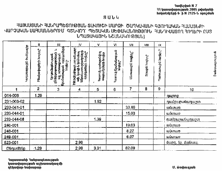 7. Հայաստանի Հանրապետության Տավուշի մարզպետին` Հայաստանի Հանրապետության կառավարության 2000 թվականի հոկտեմբերի 23-ի N 656 որոշմամբ սահմանված կարգով` սկզբնական հաշվառման տվյալների հիման վրա ապահովել մարզի տարածքում ընթացիկ հաշվառման աշխատանքների իրականացումը:
