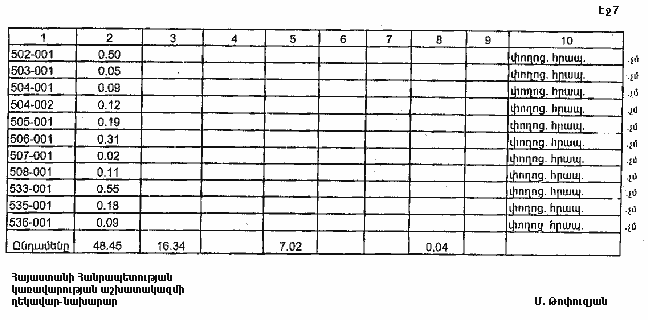 7. Հայաստանի Հանրապետության Կոտայքի մարզպետին` Հայաստանի Հանրապետության կառավարության 2000 թվականի հոկտեմբերի 23-ի N 656 որոշմամբ սահմանված կարգով` սկզբնական հաշվառման տվյալների հիման վրա ապահովել մարզի տարածքում ընթացիկ հաշվառման աշխատանքների իրականացումը: