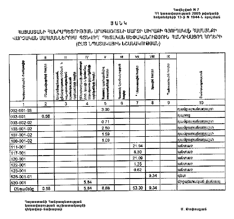 ՀԱՅԱՍՏԱՆԻ ՀԱՆՐԱՊԵՏՈՒԹՅԱՆ ԱՐԱԳԱԾՈՏՆԻ ՄԱՐԶԻ ՄԻՐԱՔԻ ԳՅՈՒՂԱԿԱՆ ՀԱՄԱՅՆՔԻ ՎԱՐՉԱԿԱՆ ՍԱՀՄԱՆՆԵՐՈՒՄ ԳՏՆՎՈՂ` ՊԵՏԱԿԱՆ ՍԵՓԱԿԱՆՈՒԹՅՈՒՆ ՀԱՆԴԻՍԱՑՈՂ ՀՈՂԵՐԻՑ ՄԻՐԱՔԻ ԳՅՈՒՂԱԿԱՆ ՀԱՄԱՅՆՔԻՆ ԱՆՀԱՏՈՒՅՑ ՓՈԽԱՆՑՎՈՂ ՀՈՂԵՐԻ (ԸՍՏ ՆՊԱՏԱԿԱՅԻՆ ՆՇԱՆԱԿՈՒԹՅԱՆ) | |