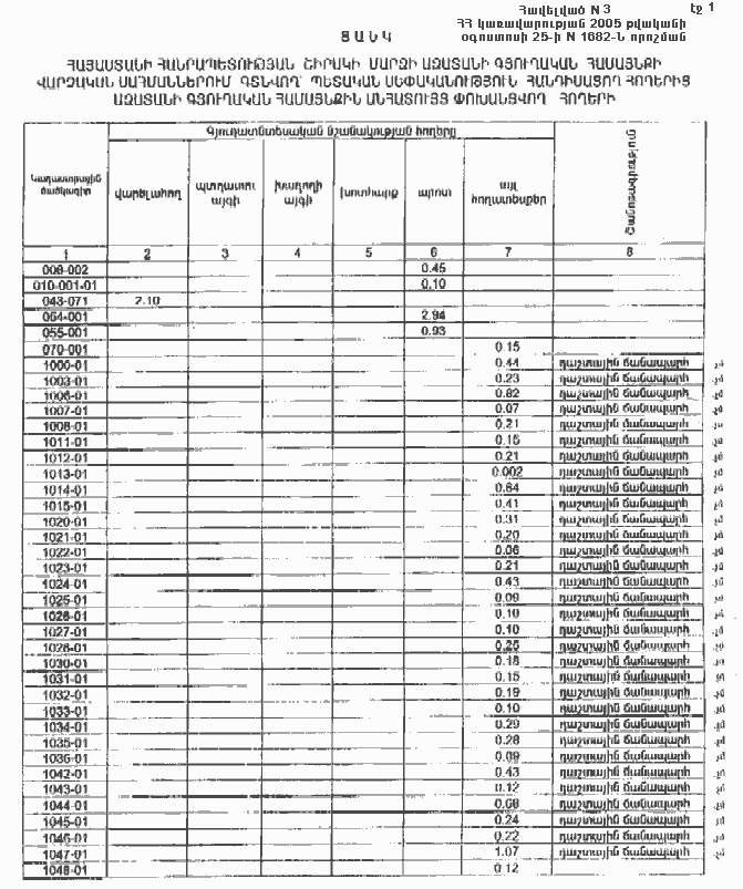 3. Ընդունել ի գիտություն Հայաստանի Հանրապետության Շիրակի մարզի Ազատանի գյուղական համայնքի հողային ֆոնդի առկայության և բաշխման մասին հաշվետվությունը` 2005 թվականի հունվարի 1-ի դրությամբ` համաձայն NN 6 և 7 հավելվածների: