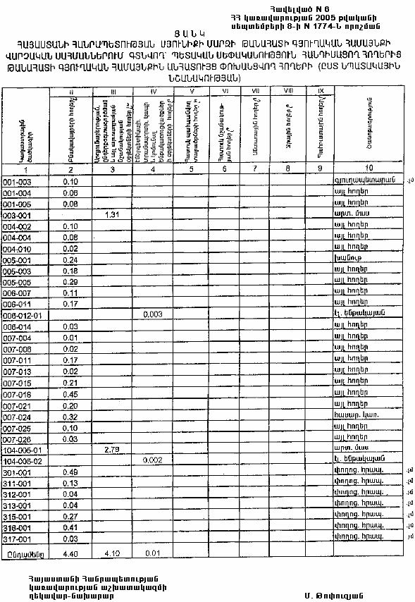 4. Ընդունել ի գիտություն Հայաստանի Հանրապետության Սյունիքի մարզի Թանահատի գյուղական համայնքի հողային ֆոնդի առկայության և բաշխման մասին հաշվետվությունը` 2005 թվականի հունվարի 1-ի դրությամբ` համաձայն NN 8 և 9 հավելվածների: