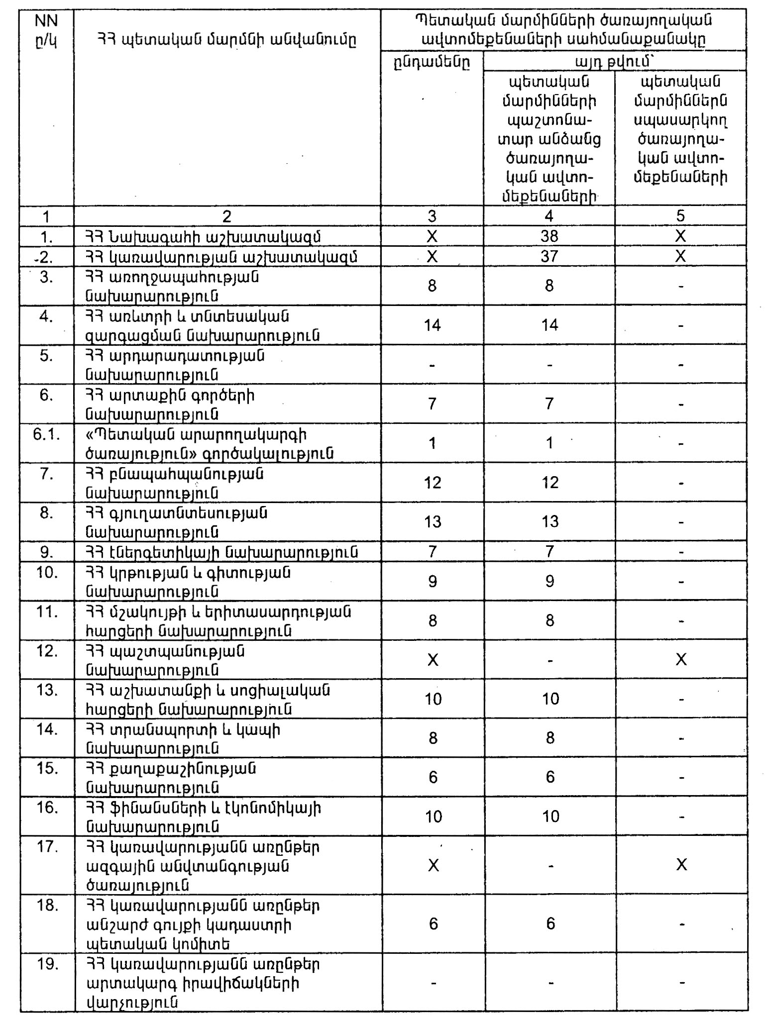 ա) Հայաստանի Հանրապետության Նախագահի աշխատակազմի, Հայաստանի Հանրապետության կառավարության աշխատակազմի, Հայաստանի Հանրապետության պաշտպանության նախարարության, Հայաստանի Հանրապետության կառավարությանն առընթեր ազգային անվտանգության ծառայության, Հայաստանի Հանրապետության կառավարությանն առընթեր Հայաստանի Հանրապետության ոստիկանության ծառայողական ավտոմեքենաների սահմանաքանակները` բացառությամբ պաշտոնատար անձանց ծառայողական ավտոմեքենաների սահմանաքանակների.