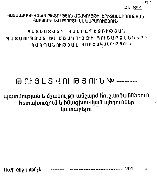 47. Հուշարձանների հետազոտման հատուկ աշխատանքները (զոնդավորում, պեղումներ, ֆիզիկական հետազոտության նպատակով փորձանմուշների առանձնացում և այլն) կատարվում են լիազորված մարմնի թույլտվությամբ` համաձայն սույն կարգի IV բաժնի պահանջների: