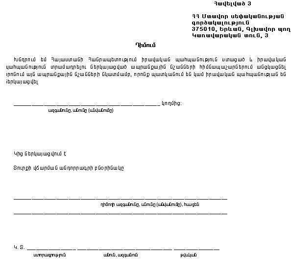 Դիմումին կցվում է օրենքի 18-րդ հոդվածի 4-րդ կետի «ժզ» ենթակետով նախատեսված պետական տուրքի վճարման անդորրագրի բնօրինակը։