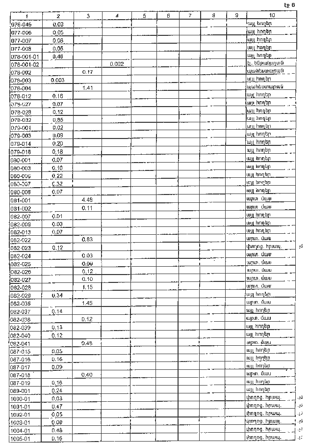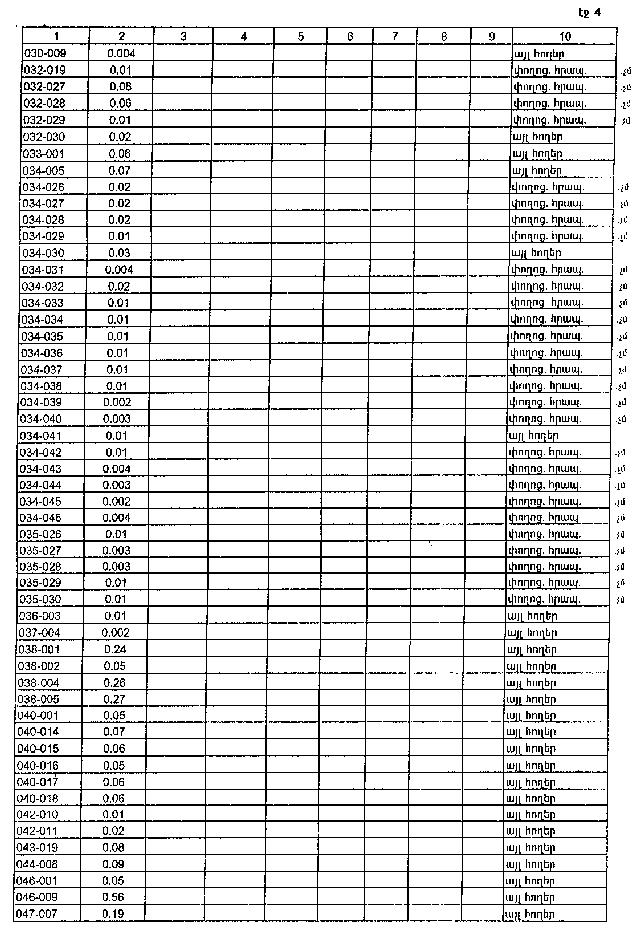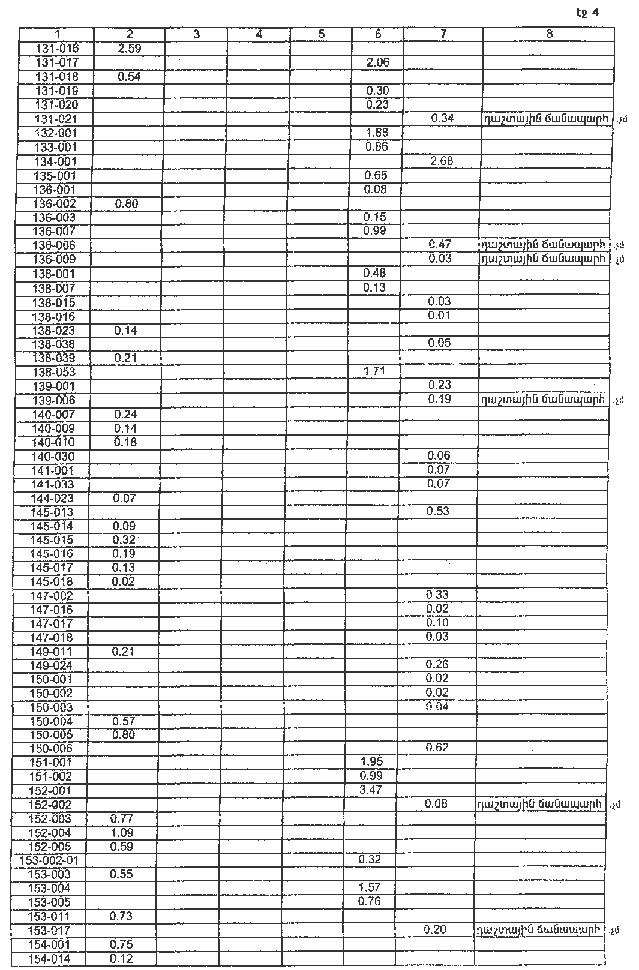 4. Ընդունել ի գիտություն Հայաստանի Հանրապետության Արագածոտնի մարզի Փարպիի գյուղական համայնքի հողային ֆոնդի առկայության և բաշխման մասին հաշվետվությունը՝ 2005 թվականի հունվարի 1-ի դրությամբ՝ համաձայն NN 8 և 9 հավելվածների: