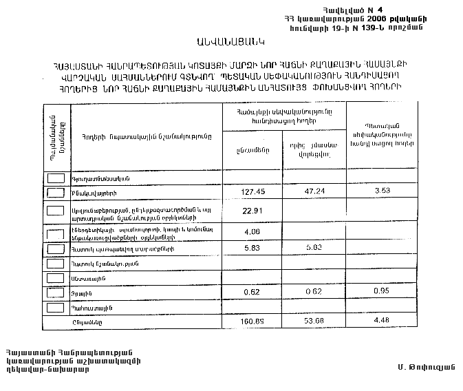 4. Ընդունել ի գիտություն Հայաստանի Հանրապետության Կոտայքի մարզի Նոր Հաճնի քաղաքային համայնքի հողային ֆոնդի առկայության և բաշխման մասին հաշվետվությունը` 2005 թվականի հունվարի 1-ի դրությամբ` համաձայն N 7 հավելվածի: