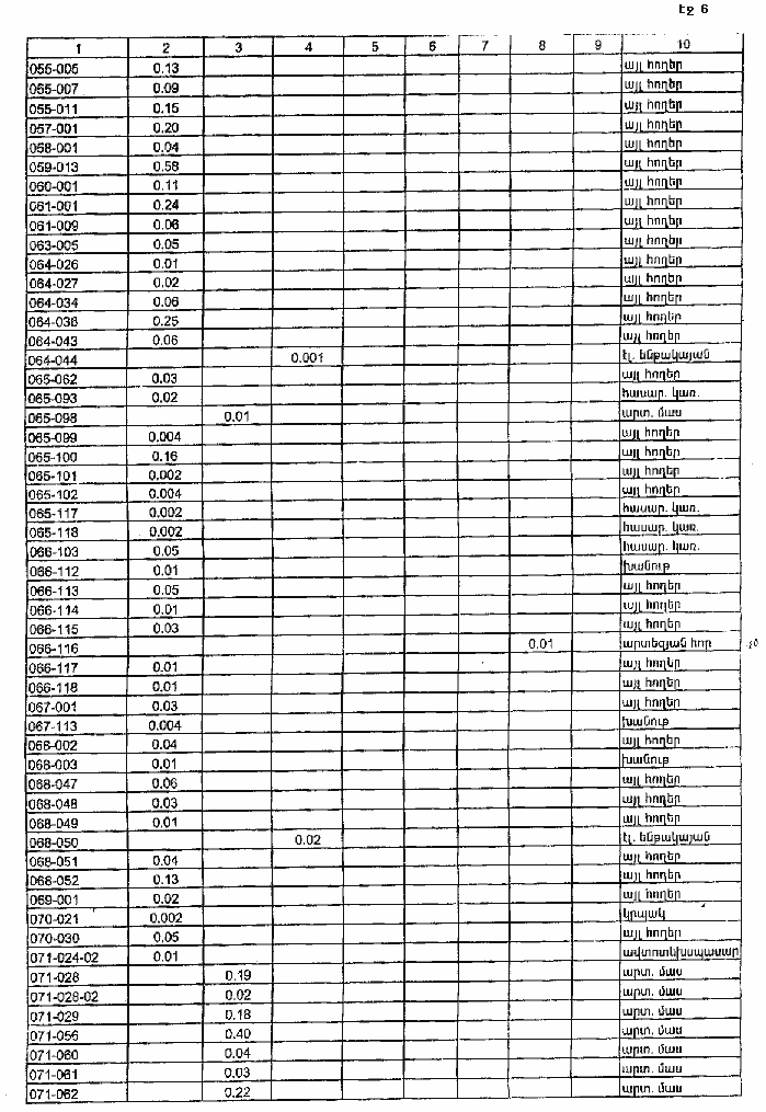 6. Թույլատրել Հայաստանի Հանրապետության կառավարությանն առընթեր անշարժ գույքի կադաստրի պետական կոմիտեի նախագահին Հայաստանի Հանրապետության պետական գեոդեզիական ցանցի հավասարակշռման արդյունքների հիման վրա Հայաստանի Հանրապետության վարչատարածքային միավորների սահմանանիշերի կոորդինատների ժողովածուի հրատարակումից հետո հողային ֆոնդի ընթացիկ հաշվառման ժամանակ Հայաստանի Հանրապետության Կոտայքի մարզի Արզականի գյուղական համայնքի հողային հաշվեկշռում սահմանված կարգով կատարել համապատասխան փոփոխություններ: