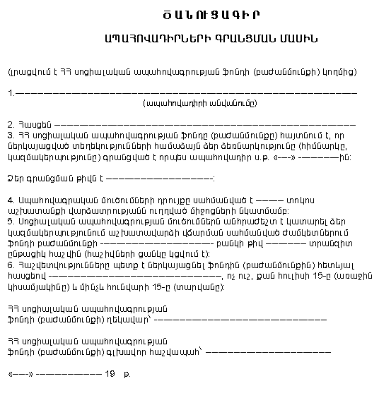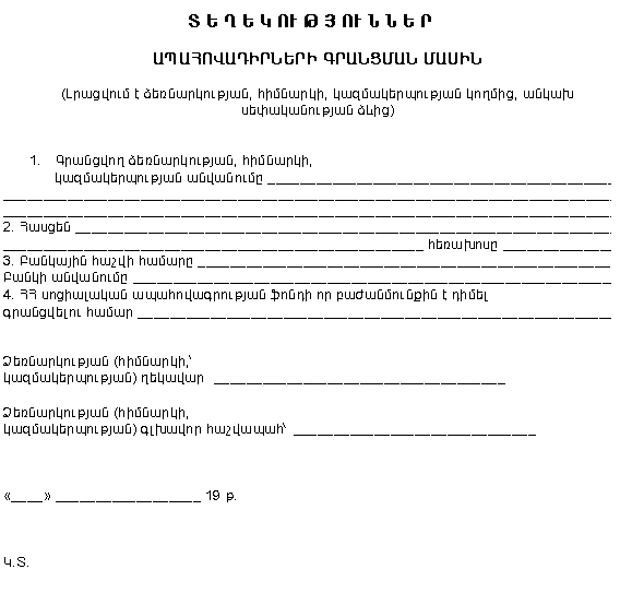 1. Գրանցվող ձեռնարկության, հիմնարկի, կազմակերպության անվանումը ____________________________ _____________________________________________________________________________________________ 2. Հասցեն ___________________________________________________________________________________ ________________________________________________________________ հեռախոսը __________________ 3. Բանկային հաշվի համարը ___________________________________________________________________ Բանկի անվանումը ____________________________________________________________________________ 4. ՀՀ սոցիալական ապահովագրության ֆոնդի որ բաժանմունքին է դիմել գրանցվելու համար ____________ |