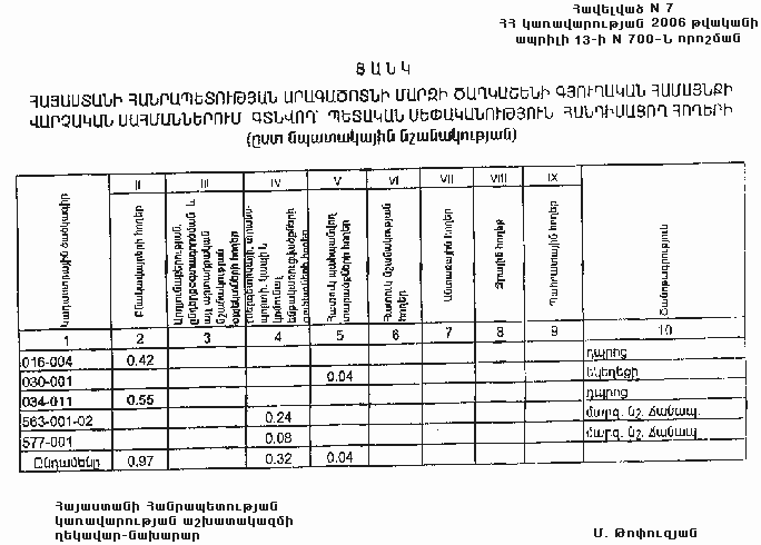 7. Հայաստանի Հանրապետության Արագածոտնի մարզպետին՝ Հայաստանի Հանրապետության կառավարության 2000 թվականի հոկտեմբերի 23-ի N 656 որոշմամբ սահմանված կարգով՝ սկզբնական հաշվառման տվյալների հիման վրա ապահովել մարզի տարածքում ընթացիկ հաշվառման աշխատանքների իրականացումը: