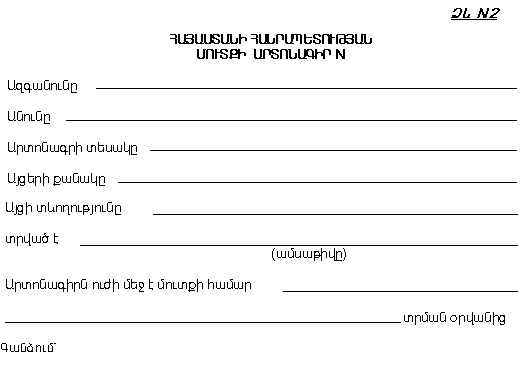 4. Հայաստանի Հանրապետությունում գտնվող օտարերկրյա քաղաքացիները պարտավոր են ունենալ իրենց ինքնությունը հաստատող` միջազգայնորեն ճանաչված փաստաթուղթ (այսուհետև` անձնագիր) և այն ներկայացնել Հայաստանի Հանրապետության ներքին գործերի կամ իրավասու այլ պետական մարմինների ներկայացուցիչների պահանջով: Օտարերկրյա քաղաքացին անձնագիրը կորցնելու մասին պետք է անհապաղ հայտնի ներքին գործերի համապատասխան մարմնին: Օտարերկրյա քաղաքացու խնդրանքով նրան կարող է տրվել անձնագիրը կորցնելու մասին տեղեկանք (N 1 ձևը կցվում է):