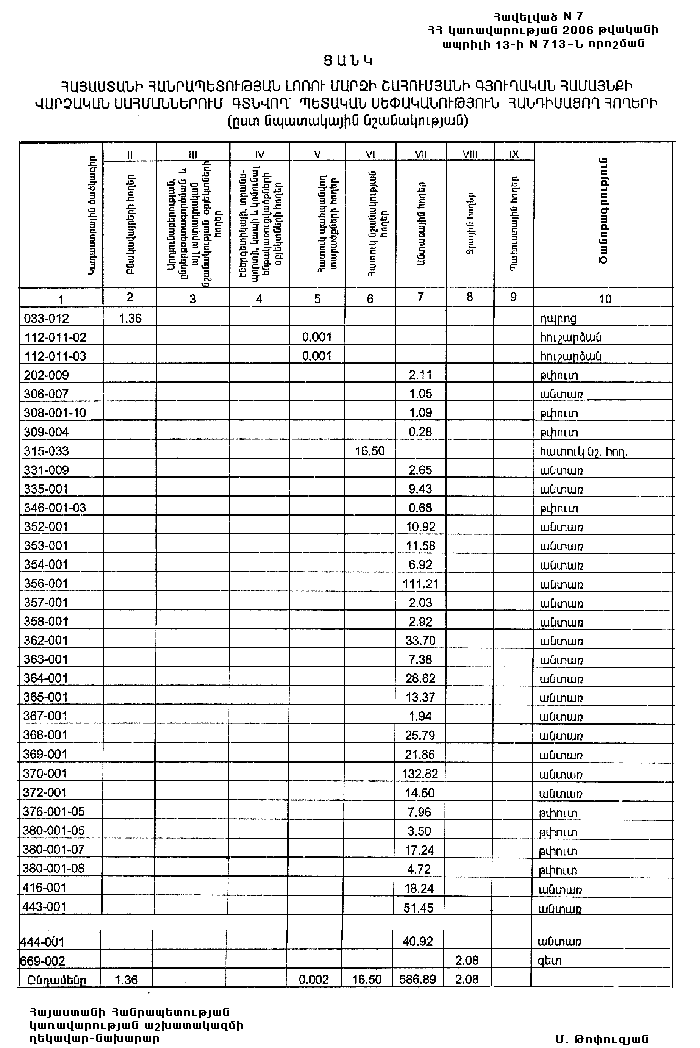 7. Հայաստանի Հանրապետության Լոռու մարզպետին` Հայաստանի Հանրապետության կառավարության 2000 թվականի հոկտեմբերի 23-ի N 656 որոշմամբ սահմանված կարգով` սկզբնական հաշվառման տվյալների հիման վրա ապահովել մարզի տարածքում ընթացիկ հաշվառման աշխատանքների իրականացումը: