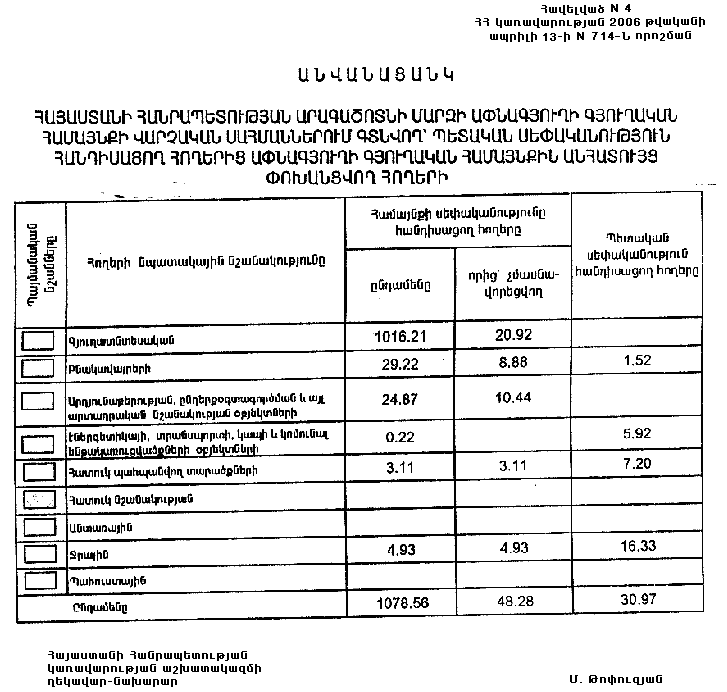 ա) Հայաստանի Հանրապետության Արագածոտնի մարզի Ափնագյուղի գյուղական համայնքին անհատույց սեփականության իրավունքով փոխանցվող 1078.56 հեկտար հողերից 48.28 հեկտարը մասնավորեցման ենթակա չէ.