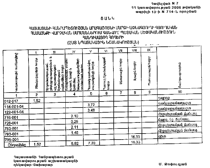 7. Հայաստանի Հանրապետության Արագածոտնի մարզպետին` Հայաստանի Հանրապետության կառավարության 2000 թվականի հոկտեմբերի 23-ի N 656 որոշմամբ սահմանված կարգով` սկզբնական հաշվառման տվյալների հիման վրա ապահովել մարզի տարածքում ընթացիկ հաշվառման աշխատանքների իրականացումը: